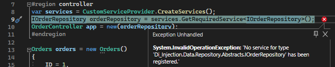 Constructor injection yönteminde di service registration işlemini console uygulamalarında dependencyinjection paketi ile sağlıyoruz. CustomServiceProvider isimli class ımızda serviceprovider nesnesinde kendi nesnelerimizi register ediyoruz. Daha henüz derleme aşamasında interface i çağırdığımızda bize ne vermesi gerektiğini söylemek için tabi… Runtime da aşağıdaki hatayı alırız yoksa.