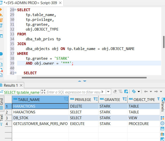 Genel olarak şuana kadar STARK kullanıcısına hangi yetkileri verdiğimizi görmek için; dba_tab_privs ve dba_objects view lerinini sorgulamamız gerekiyor;