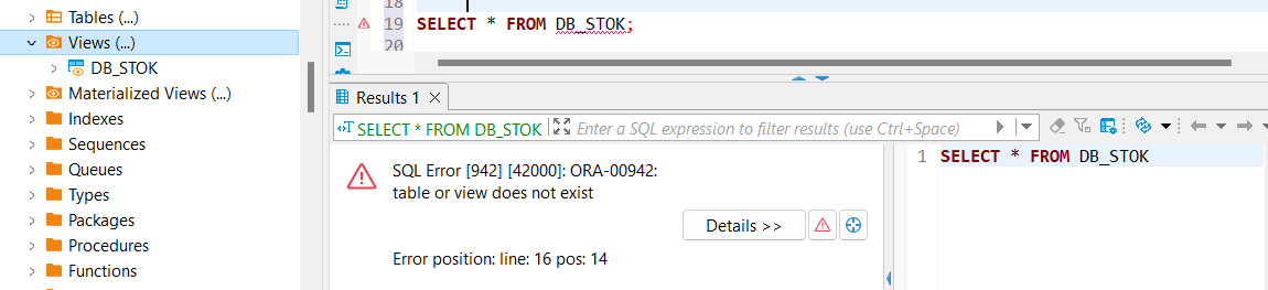 STARK kullanıcısına view üzerinden yetki verme işlemi öncesi herhangi bir view e select sorgusunu test ediyoruz;