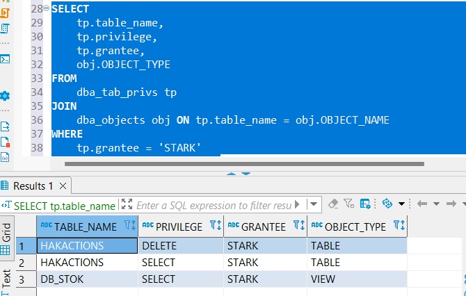 Genel olarak şuana kadar STARK kullanıcısına hangi yetkileri verdiğimizi görmek için; dba_tab_privs ve dba_objects view lerinini sorgulamamız gerekiyor;