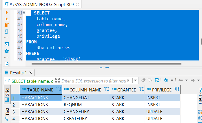 Bu işleme göre de HAKCTION tablosunda INSERT işlemi için sadece CHANGEDAT,REQNUM kolon yetkilerim varken, UPDATE işlemi için sadece CHANGEDBY,CREATEDBY kolon yetkilerim var.